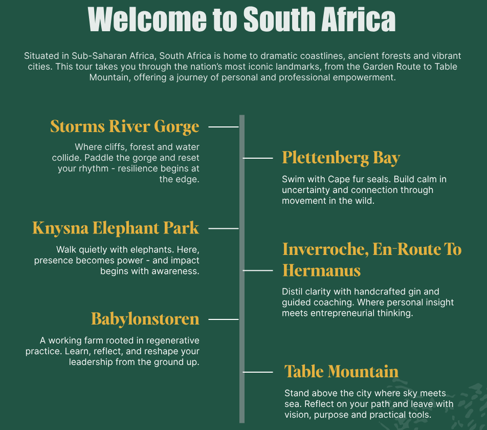 If you learn best by doing, moving, and testing your edge, start here. Expect coastlines, canopy walks, river gorges, seals, elephants, and Table Mountain reflections — each experience paired with structured sessions that turn adrenaline into leadership clarity.