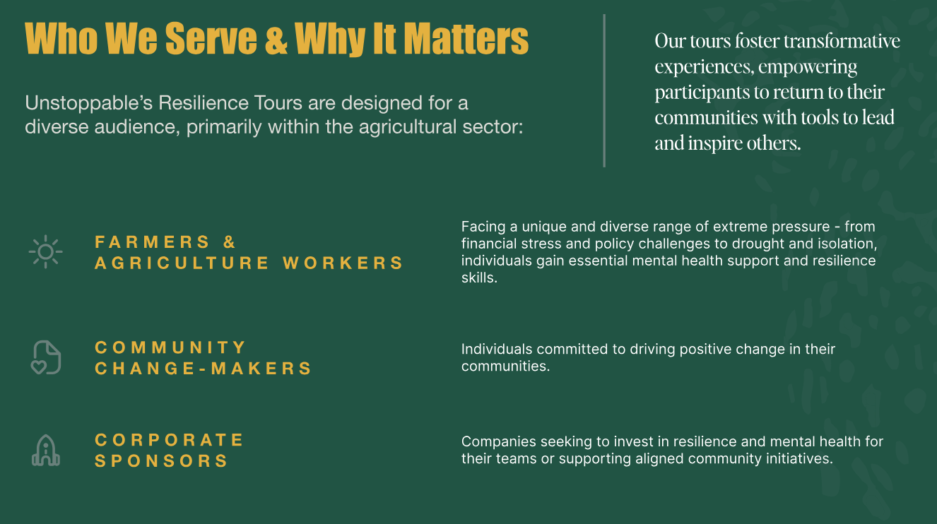 Unstoppable World exists to build that skill — not in a classroom, but in living classrooms: farms, coastlines, forests, and communities. Think immersive Resilience Tours, supported by expert collaborators and a clear pathway to impact.